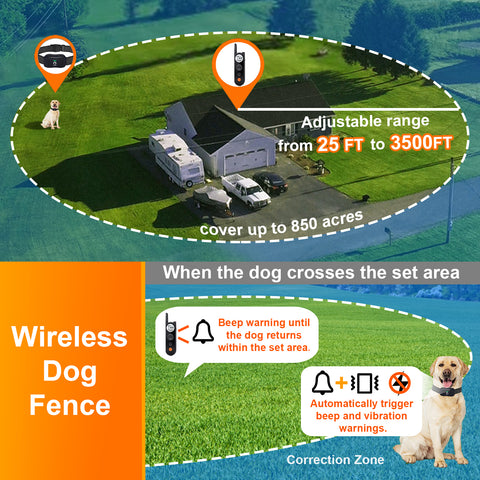 Thanks to the advanced technology adopted, our device combines the function of wireless fence and remote dog training. It work differently in different modes.